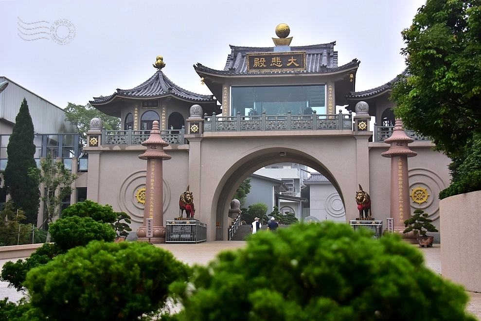 ↓進入山門,迎面而來的是一座灰白色石材結構的「大悲殿」,屋頂鋪設仿唐式瓦片,線條簡潔而不失莊嚴。作為寺中的第一座主要建築,大悲殿的命名顯然與創寺者「福慧尼師」息息相關——尼師一生專修大悲法門,持誦《大悲咒》,並以加持「大悲水」廣濟信眾,深受敬仰。「大悲殿」正是這份修行精神的象徵,不僅點出她慈悲為懷的修行核心,也讓整座寺廟自入口處起就流露出慈悲為本的氛圍。