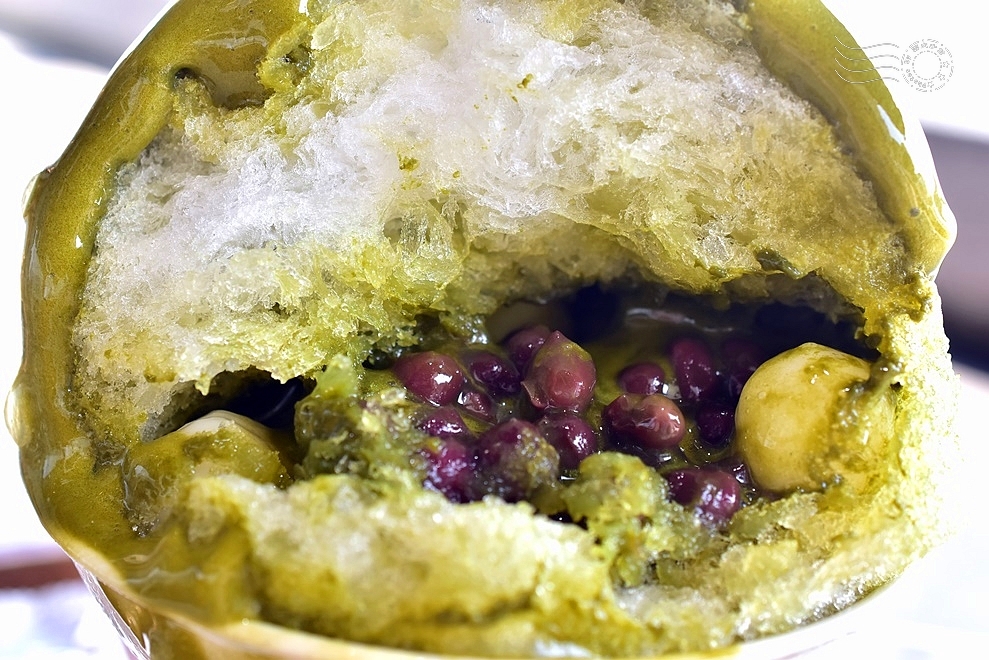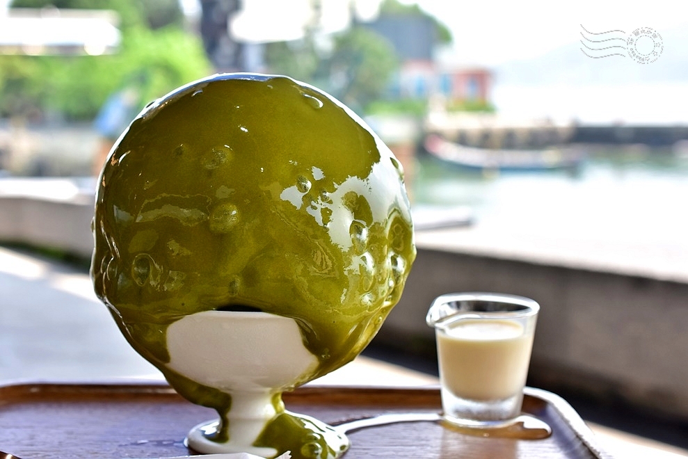 ↓還特地選了戶外座位,企圖營造一種「冰品配河景」的日系悠閒氛圍,孰料這款「ESPUMA宇治金時刨冰」(日式抹茶紅豆)才剛上桌,外層那夢幻綿密的抹茶慕斯立刻迅速溶化,悠閒還來不及感受,就先變成一個搞笑現場。