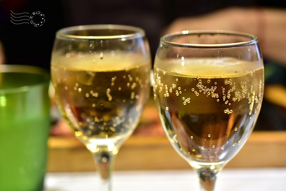 ↓服務生無預期招待我們兩杯香檳,原來隔壁桌的老先生把鞋襪脫了。老實說我根本沒發現,服務人員卻這樣貼心,對西堤的好印象又更上一層樓了。