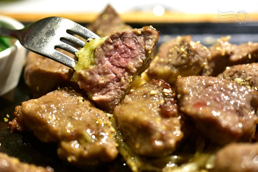 ↓8oz的骰子牛,我猜是肋眼,七分熟,簡單的調味,佐以焦甜的洋蔥,口感嫩滑稍帶嚼勁,肉食動物的快樂啊!