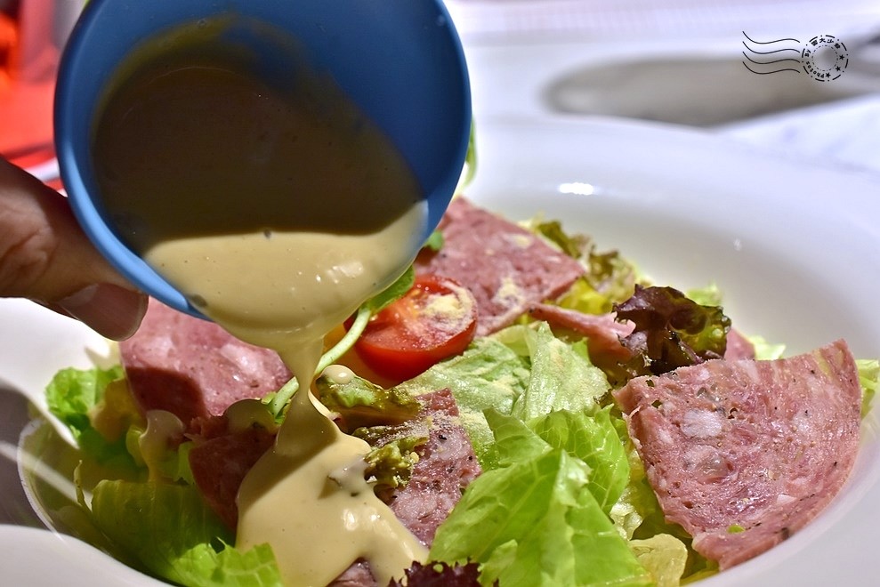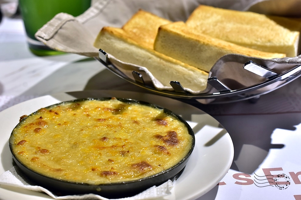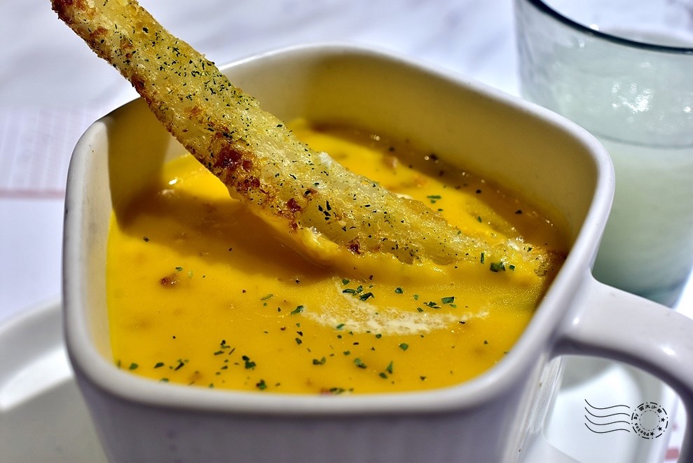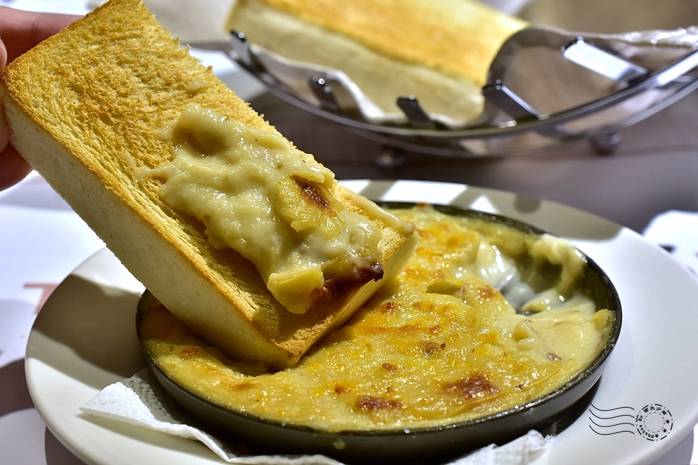 雙面都烤得金黃的方塊麵包,沾取熱燙 creamy 的焗烤蘑菇醬,蘑菇的清香、乳酪的香濃,與麵包的酥脆,每一口都充滿了豐富的層次——麵包可續,如果不是後面還有主餐,真的會想一口接一口吃到飽。