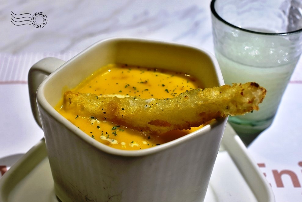 ↓湯品二:燻雞南瓜濃湯,上頭還擺了一支烤吐司。