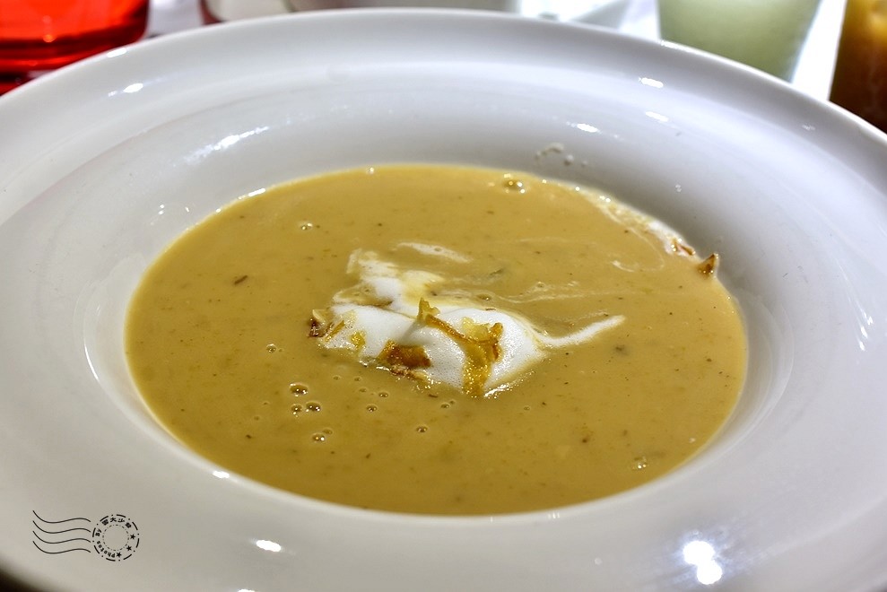 ↓湯品一:法式松露菌菇濃湯,高湯現場倒入,產生泡泡,非常有儀式感的法式料理。裡面的菌菇切成細細碎碎的,松露氣息濃郁。