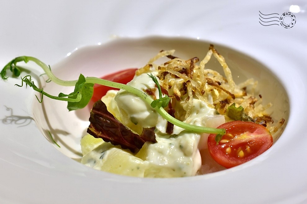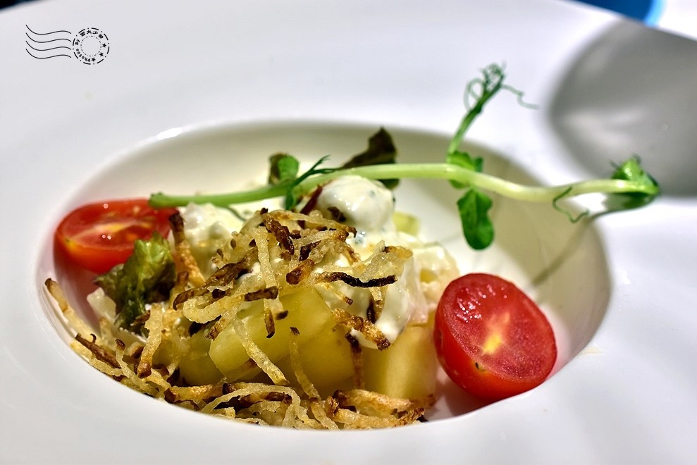 ↓沙拉一,朋友的,洋芋田園沙拉:優格醬馬鈴薯沙拉,脆薯絲、美生菜和紅捲葉。