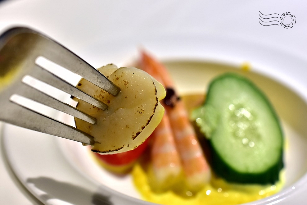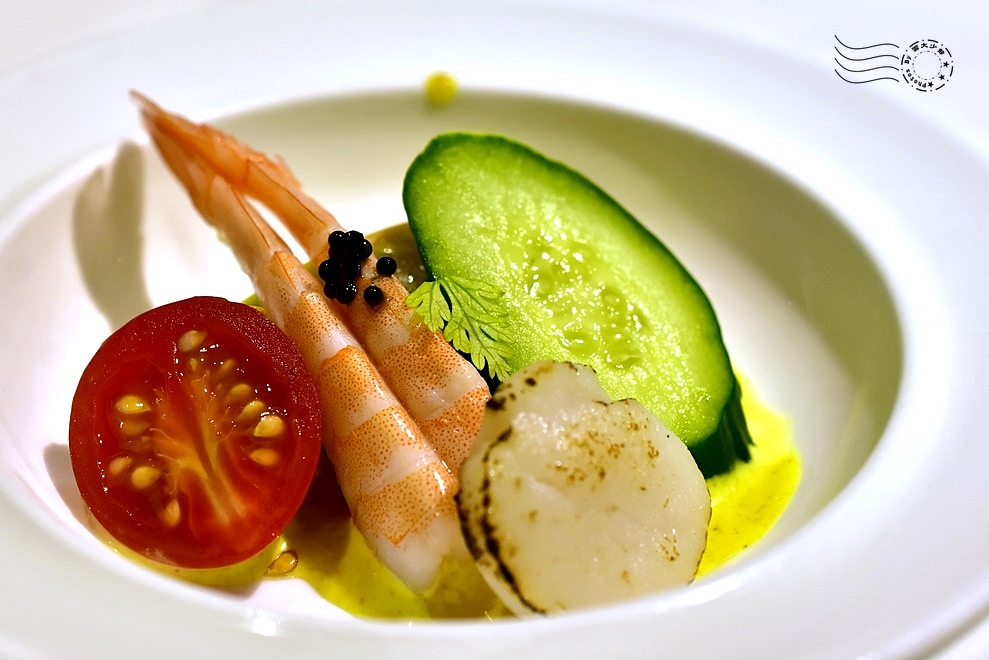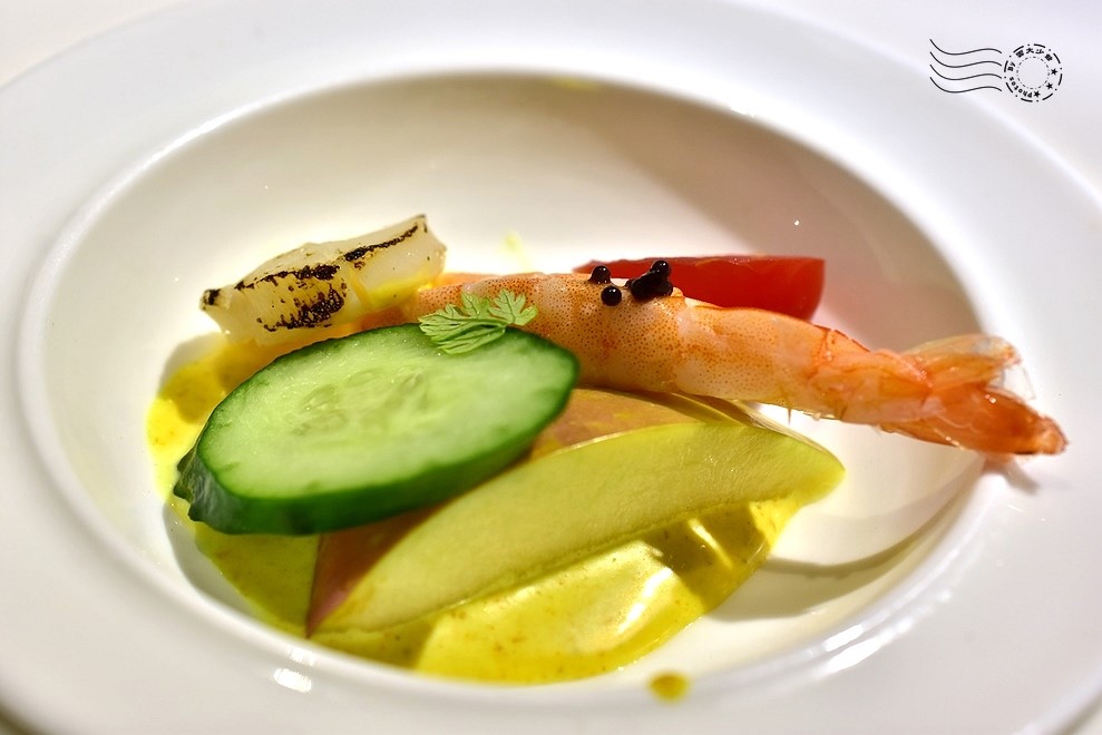 咖哩不辛辣、偏溫和,散發淡雅的香料氣息,與優格的微酸相互調和,使整體滋味更加圓潤。再搭配小黃瓜與蘋果的清新果香,為海鮮增添爽脆層次,讓鮮蝦的鮮甜更加突出,交織出細膩而和諧的風味。