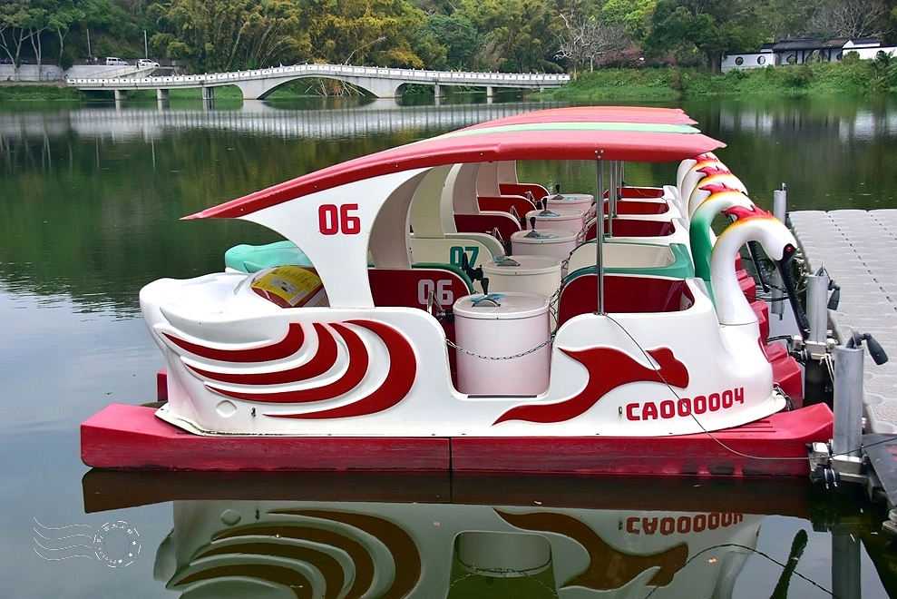 ↓青草湖新搭建了浮動碼頭,提供 SUP 立槳、天鵝船等水上活動,現場也有清楚的開放時間與價位告示。不過今天真的是幽靜靜,營業時間內也沒有遊客上湖體驗。