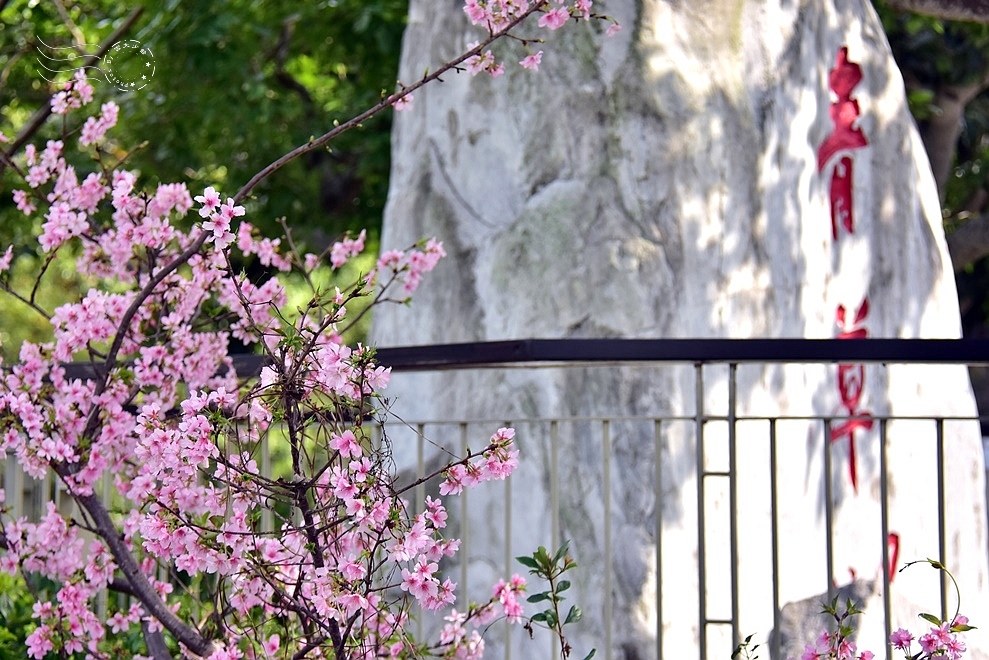 ↓是櫻花季尾聲時分,【青草湖】地標石碑前,是到此一遊的必須打卡點。