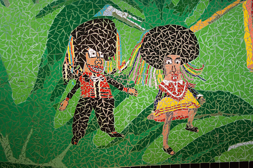 一身髒的在鷹架上黏貼壁畫馬賽克