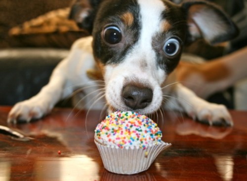 看見繽紛的杯子蛋糕在眼前,這隻小狗的表情充滿戲劇效果!