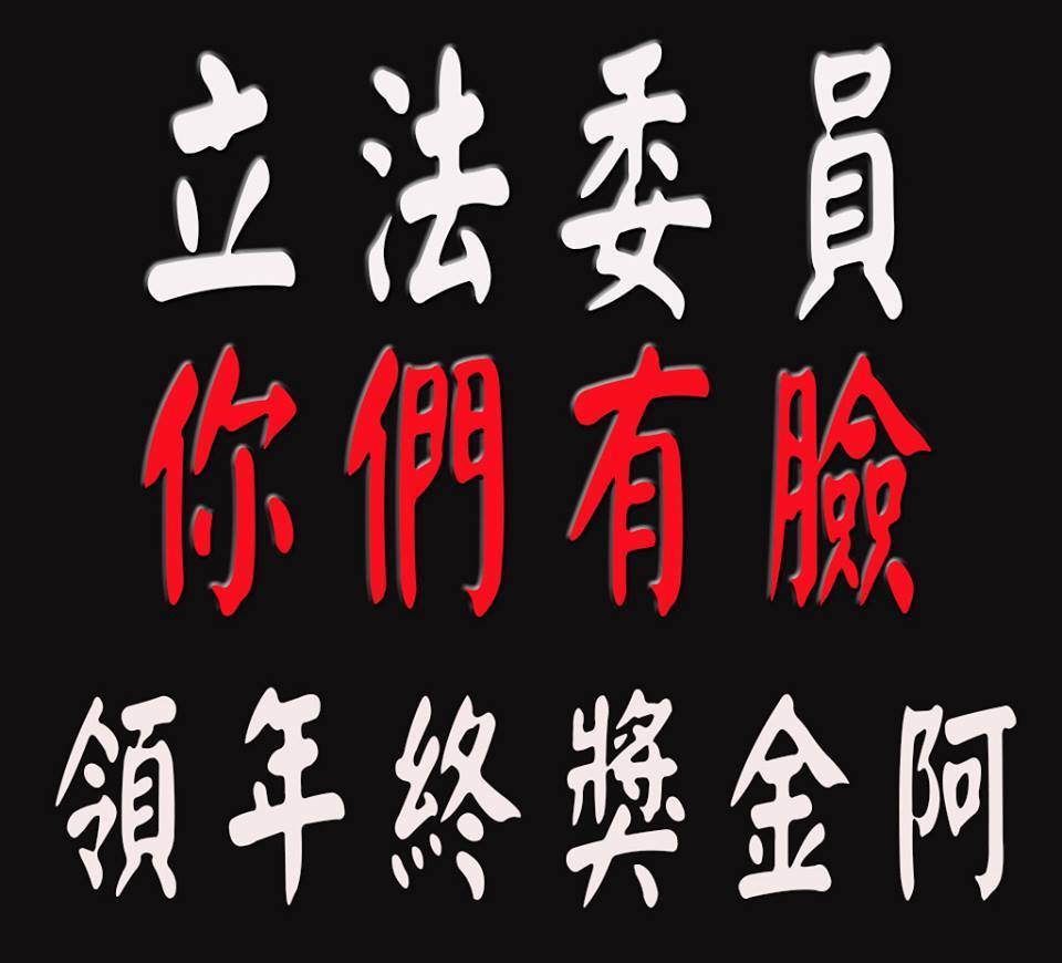 今年台灣的經濟表現不佳,經建會主委管中閔被立委砍一半年終獎金,「爺們不在乎」,但人民在乎,在乎生活。可是立委只會砍官員19.5萬年終,而以立委諸公、諸母的經年胡鬧及王金平、柯建銘醜陋關說的表現,不是趁暗夜荒腔走板通過舉國痛罵的「顏清標除罪條款」,就是不好好立法,為國為民拼經濟,只會在立院鎖門不是吹冷氣,流口水睡成一團,就是霸佔主席檯,阻擋「服貿」不好好開會。