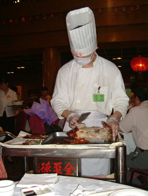 到了百年全聚德烤鴨店.裡面已有不少人了.裡面裝潢古色古香.服務生.帶位的全是宮廷服打扮.我們3 個人點一隻全鴨.及北京的道地小菜跟鴨羹.再等待途中聞到陣陣的烤鴨味.口水已直流.約20分師傅終於帶著傳說中的烤鴨上場了.好大的一隻色澤紅潤略帶金黃ㄉ脆皮烤鴨.身上還冒著陣陣ㄉ煙.師傅很俐落ㄉ沏下一片鴨肉時.鴨身還冒出的汁液.趕緊把口中ㄉ水口吞進去.在等待師傅快速沏鴨肉的同時.我也趕緊的邊跟可口的烤鴨及認真的師傅合影.等到師傅沏好時.馬上夾一個超大的脆皮鴨肉跟大蔥.醬跟麵皮包好.大口吃下去.真的很好吃.皮真ㄉ脆脆ㄉ不油.連吃ㄌ幾個才暫休息一下.配上清爽的小菜.真ㄉ很過癮![]()