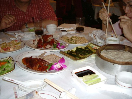 眺望ㄌ雄偉壯麗ㄉ紫禁城後.在灰茫茫中也看不到什麼下.於是決定去吃到北京ㄉ第一參(晚餐).吃ㄉ當然是傳說中ㄉ北京烤鴨.去了百年老店的全聚德烤鴨店.去的途中經過了ㄧ間百年的天主教教堂.很美的一間教堂.廣場裡有很多年輕人在划滑板.也有一對對的情侶在談情說愛真的很浪漫.