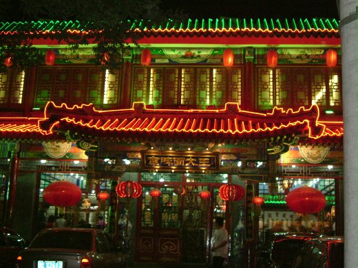 參觀之後只有一各感想之前的主人真的是一位有權有勢的皇族.整各建築的格局就是氣派.講究.聽北京朋友說現在北京能有這麼大規模的四合院沒幾間了.其中我們參觀這間是最大最完整的.真的讓我跟我朋友大開眼界.四合院的斜對面也有一間很氣派的四合院前面還站了一名解放軍.聽說裡面住的是政府的高官.參觀完時已經天黑了.這時我們所在的胡同裡的四合院門口都掛了大大ㄉ紅燈籠.真的有"大紅燈籠高高掛"的感覺喔~這時肚子差不多餓了.我們去吃北平麵食-炸醬麵..在去餐館的路上我開始不舒服了.頭痛加上有點噁心.到了餐館裡頭坐滿滿的人加上食物的味道.我們點的東西還沒上菜.我已經去廁所吐了2次.加上拉肚子.根本沒食慾吃東西.結果因為我的關係.第2天晚上的節目就草草結束.回飯店休養.還好我帶了藥吃.隔天身體還好沒事.我們猜想一定是我中暑ㄌ.我還真是阿婆的身體勒.