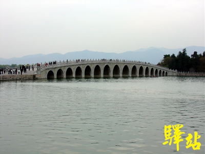 我那熱情招待的北京朋友鉅細彌遺.詳細介紹可媲美了專業的導遊.為了讓我們能體驗不同的遊頤和園.我們搭船的方式.捨棄跟遊客擠來擠去的走路.為了感激北京朋友一路相隨陪伴.於是由我跟朋友2位弱女子在昆明湖採著腳踏船.載著他遊頤和園.讓他過足帝王之癮.踏法一致駛向湖中.湖風煦煦吹來.沿路邊唱著應景的歌..看著沿湖邊都是柳樹垂映.看到什麼景點.把船靠邊就上岸. .真的很愜意.經過玉帶橋時.把船停靠岸邊.北京朋友說玉帶橋的橋底下有一各很有趣的現象.叫我們體驗一下.也就是待在拱橋下的一邊.沿著牆壁合掌拍打.你會發現拍掌聲會隨著拱橋的拱型~波~波~波~傳到另一邊…嘩!!真的很奇妙..利用建築體傳達聲波..那種像是在山谷裡吶喊船回來的回音.有機會去的朋友真的可以試試看.