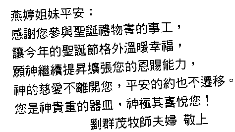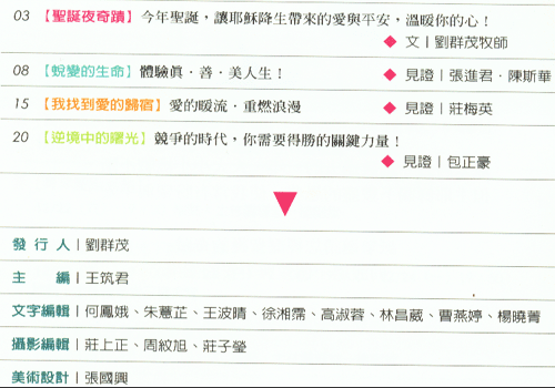 當我回家之後,打開這個聖誕禮物書時,我才明白的笑了出來,原來,五、六月份的編輯見證,是要收錄在這一個特別的禮物書當中,在特刊中的「文字編輯」裡,有我的名字:曹燕婷。我怎麼不會欣喜尖叫,太意外了,也才讓我知道,原來在聖誕節前半年,就開始了聖誕節,這個對基督徒來說,非常重要的日子,一切聚會、節目編排、文字紀錄、平安夜的首望,教會已經開始工作,尋找能夠配合的弟兄姊妹,我高興的是被神使用,因為我的文字能力而成為教會的義工,非常喜樂,非常開心的大聲感謝主耶穌基督。