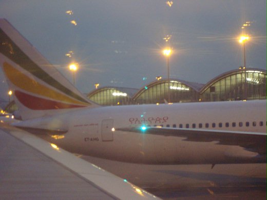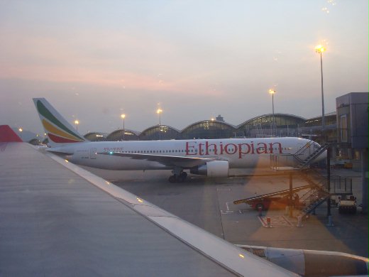 在香港機場看到的, 我從拼音上猜測它是"衣索比亞"的飛機, 回國後查字典, 果然沒猜錯. 機身的圖騰色彩鮮豔, 文字更是特殊, 說真的, 比我們像牙膏一樣的空軍一號漂亮多了!
