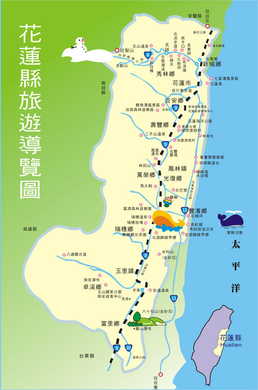 感謝網路的發達, 讓我可以上網挑選民宿, 對台灣地理不太熟悉的我, 只能憑著一張網路上列印的【花蓮縣旅遊導覽圖】, 加上用google map計算路程, 來安排行程和住宿.
