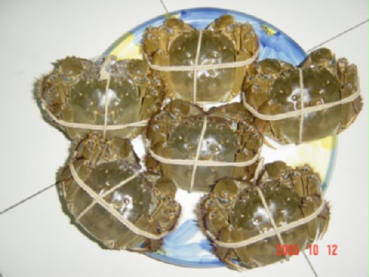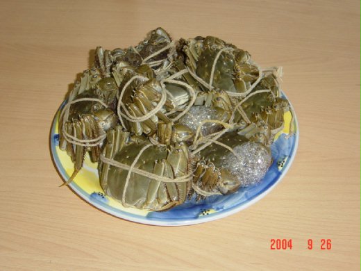 (上圖是2004年買的大閘蟹, 下圖是2005年買的, 用相同的盤子裝, 看倌們應該可以看的出來大閘蟹的個頭差很多喔! )
