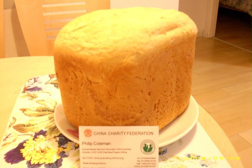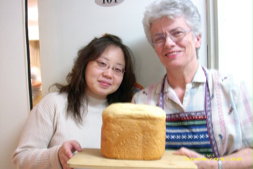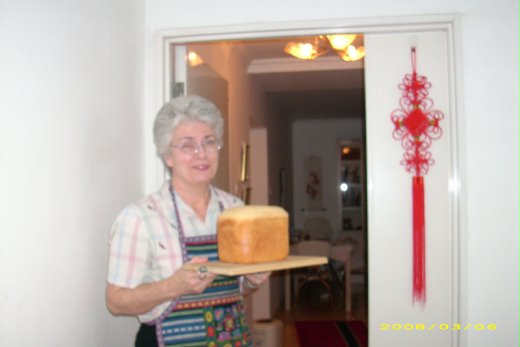 門外站著親愛的鄰居Donna阿姨,她和丈夫Phil叔叔來自西雅圖﹝Seattle﹞,她說「I'm baking the bread for you, probably it will be done at about 10pm.」呵呵!她之前烘焙麵包的香味充滿整個樓層,我向她提過,她詳細說明如何揉麵、放酵母、觀察發酵情況,而過年後我帶了一盒台灣的鳳梨酥給他們,又常常她會拿中文教材來問我生字文法造句,所以她要送我新鮮現烤的麵包。