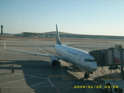 除夕當天的北京街頭人車稀少,這是第一年除夕日就放假,往年這一天都還要上班,好在我們有先約車來接,否則大部份的出租車師傅都不住城裏,這一天也都休息了,出租車師傅直說這樣開車太暢快了。往機場的路上還真沒見到幾輛車,原本50分鐘的車程竟然30分鐘就到了;機場大廳空蕩蕩的,回家的人都早走了,check-in 手續也在10分鐘內辦妥,連海關都只開放兩個櫃台查驗護照和一條X-ray通道,於是8點半已經在候機室開始等待了,看來大家都是拼到最後一天才放假的「台勞」啊。這是我自2000年第一次進中國大陸以來,覺得人最少、最輕鬆、最舒服的登機經驗。而且這裡是北京呢!