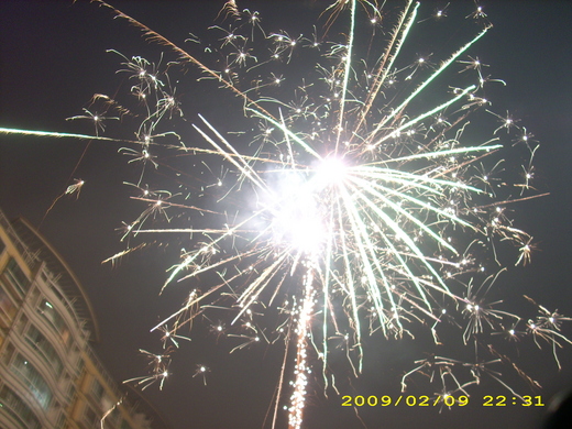 2/9是元宵節,是北京市一年中能放煙花炮竹的最後一日。前兩年我都不在,早已恭逢其盛的先生說這是一定要經歷的,太壯觀了。真的是耶,光我們一個小區放的煙花就好像國慶日一樣甚至更多,我的鄰居Ricks夫婦初來北京就逢炮仗,嚇得他們早早奔回家躲避,還以為政府發補貼給市民放煙火呢,不然怎麼好像不要錢似的放個沒完。只是苦了清潔人員,滿園子的砲灰垃圾足足讓他們掃了三天,花圃間的廢棄物還一點點地用手撿拾,真是難為。