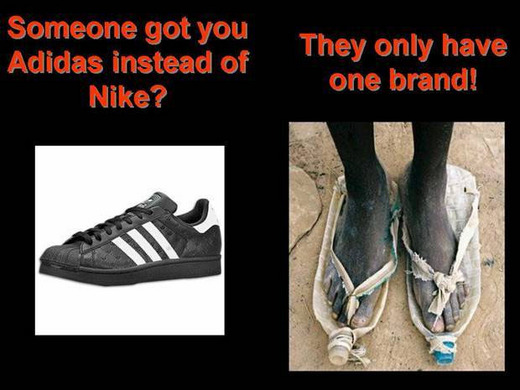 (下一)你覺得父母的嘮叨與關懷讓你很受不了?(右)而他一無所有。(下二)生氣某人有名牌耐吉而你只有愛迪達?(右)他只有一種牌子。