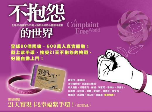 將手環戴在一隻手上,有抱怨,再換到另一隻手,如此交替更換,直到達成連續21天不抱怨、不批評、不講閒話的目標為止。