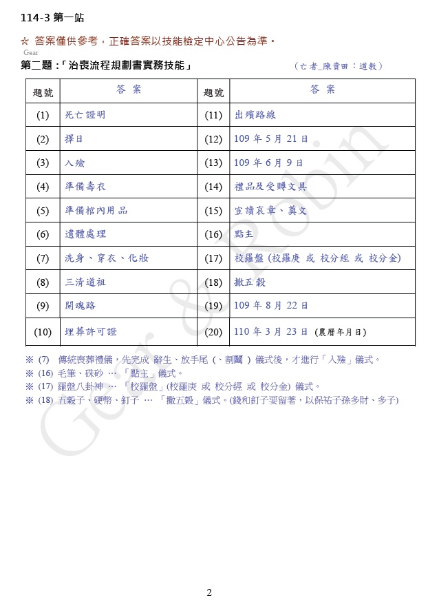 114年第一梯次 乙級喪禮服務技術士術科 第一站、第二站 參考解答
