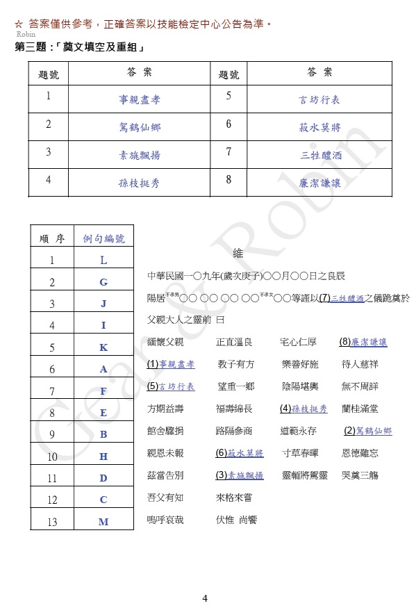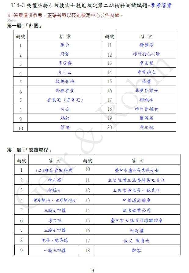 114年第三梯次 乙級喪禮服務技術士術科 第一站、第二站 參考解答