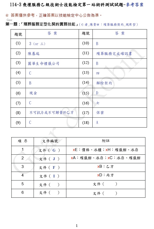 111年度第三梯次 乙級喪禮服務技術士 術科 第一站、第二站 參考解答