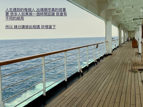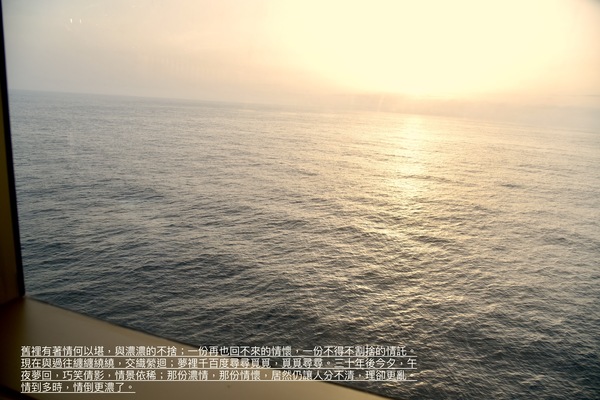 船安穩的行駛在汪洋裡。傍晚, 獨自一人靜靜地坐在 Ocean Bar, 振筆疾書, 把過往做回澄清, 做個回顧。把從前昔往再做番梳理, 方知女人對婚紗複雜的情緒。婚紗是種決心, 也是種惶恐, 對未知的一種茫然。