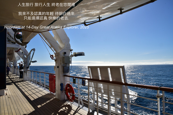2025 年主要是相陪太太高中摯友聚麗玉及其如姐妹、朋友. 她們都是首次搭遊輪, 毫無經驗的生手. 朋友先生退休沒多久後, 突然就走了, 走的如此出乎意料, 多年後説及此事, 仍是二個字的感概:突兀. 2018 年五月, 麗玉李先生夫婦連袂自台飛來, 當時李先生即表示退休後, 要走一趟阿拉斯加遊輪.