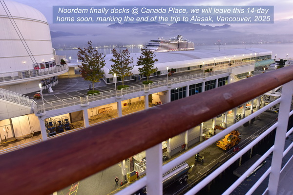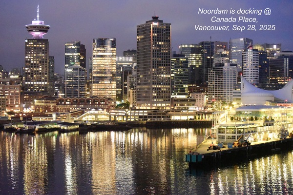 Noordam 是條 2006 年船齡20 的老船. 許是阿拉斯加遊輪季節已入尾聲, 乘客滿載, 當天温哥華港也上停了四艘遊輪.