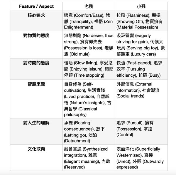 這份對比清晰地呈現了兩代人之間在價值觀、生活方式和對幸福理解上的根本差異. 老殘的哲學強調內在的平和與超脫, 而小殘則傾向於外在的物質與社會認可.