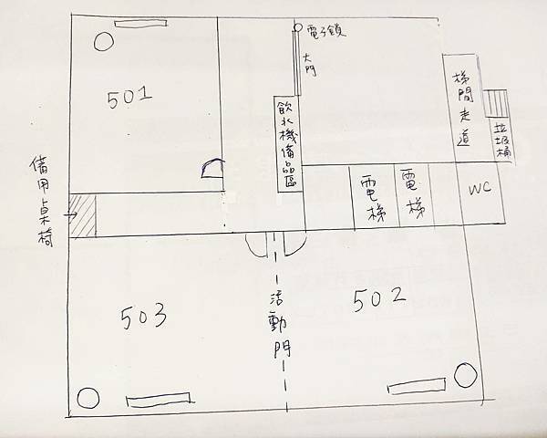 平面圖如下,共有三間教室,如果飲用水、教室備品用完了,飲水機旁的備品區都找的到唷,垃圾回收區在大門正對面的梯間,化妝室前,離去時再把垃圾分類丟好就可以囉!
