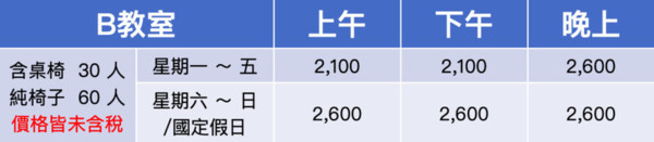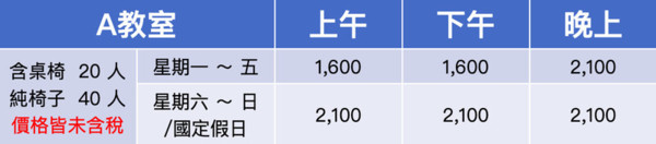 教室採 4 小時為一時段,未滿 4 小時仍以一時段計,加時費半小時 500 元,未滿半小時以半小時計:用餐不另收費用,離開前請將垃圾、便當、飲料帶走,如有髒污或垃圾未帶走,將加收 1000 元清潔費。