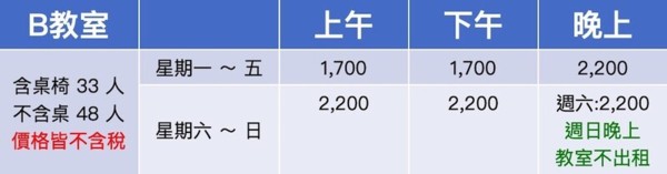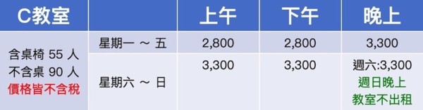 最大的教室就是C教室啦!講座型妥妥得可以坐到90人呢!是不是很適合辦演講的場地呀!全場總共有六個喇叭及兩台冷氣,舒服又省錢的辦活動這裡是最佳選擇!比較一下附近同型教室的價格及設備,CP值很高唷!