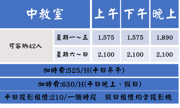 2.投影機:平日租借投影機210元/每時段;假日價格已包含投影機