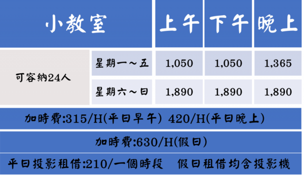 ※中教室及小教室不得用餐,大室用餐不另收費,如有髒污或垃圾未帶走,將加收 1000 元清潔費。