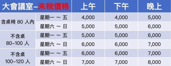 大會議室含桌已可坐81人,純以以排列的講座型則可容納100~120人,大型演講活動及說明會十分適合唷