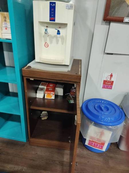 飲水機及備品櫃,藍色部分是置物櫃,可以讓學員暫放東西