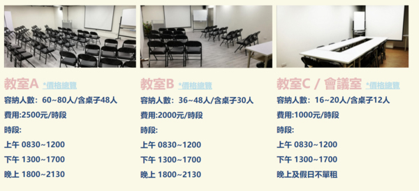 距離台南火車站步行3分鐘,可容納10-70人空間,共有A、B、C三間不同教室。