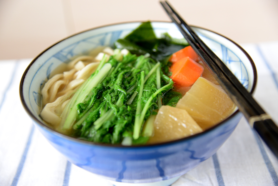 既然是上湯,就用利尻昆布為湯底,魯冬瓜好不好吃醬油極關鍵,這次用的是丸莊的竹級蔭油清,好的醬油能帶出自然的鮮甜,純釀造的醬油不像化學醬油容易死鹹,對建康也比較有利。由於冬瓜清熱,對吃素者而言,身體容易偏寒,燉冬瓜時會放點薑去寒。麵條現做但不是完全手撖,自從有了一台桌上型壓麵機,做麵條簡單方便的多,麵條要有勁,煮的時間長短要掌握的好,麵條才不會太生,又有勁道。百貨地下超市就有賣京都水菜,挑一袋回家即可自制美味的京都上湯烏龍麵。