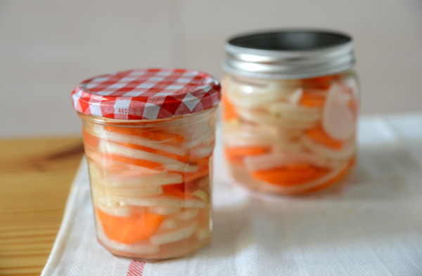 洗乾淨的蘿蔔或高麗菜稍為晾乾水份切片或塊狀,白蘿蔔建議不削皮,口感會較爽脆,灑點鹽拌勻放幾分鐘,變軟後裝進乾淨無油的玻璃罐中,倒入冷開水,天冷時約4-5天,天熱約2-3天即可食用。