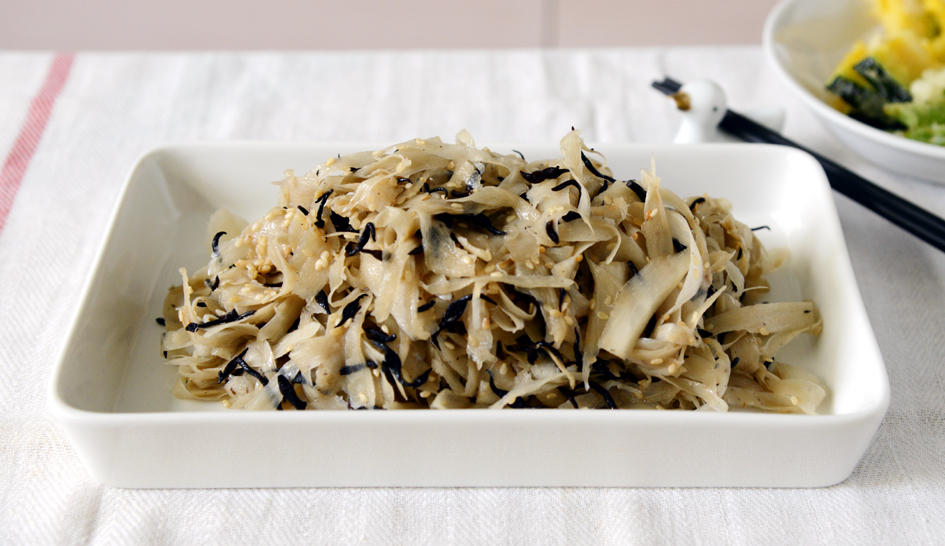 牛蒡用削皮的刨刀削片,立即泡在檸檬水中以免變黑,羊栖菜用少許的水浸泡,炒好的牛蒡放點純釀醬油、米醂、鹽,最後加入泡過的羊栖菜,起鍋前灑點芝麻。