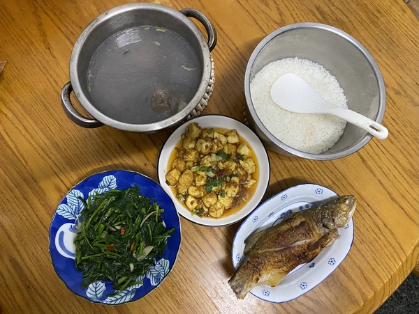 食材有三姑種的山藥和皇帝豆,加大骨熬成湯,再香煎午仔魚,還有第一次試做的金沙雞蛋豆腐。台語有句話說「一午、二紅沙、三鯧、四馬鮫」,或「一午、二紅衫、三鮸、四嘉鱲」,午仔魚因肉質細緻、少刺,在不同地方排名中,總是占據第一位,也是不那麼愛吃魚的我心目中首選。