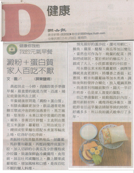 晨起快走一小時,我隨即著手準備早餐,最重要的就是方便、迅速,補足能量後再去上班。 早餐健康原則是「澱粉+蛋白質」,有膳食纖維更加分。飲品通常是無糖豆漿或沖泡奶粉加燕麥片、黑芝麻粉、堅果粉...