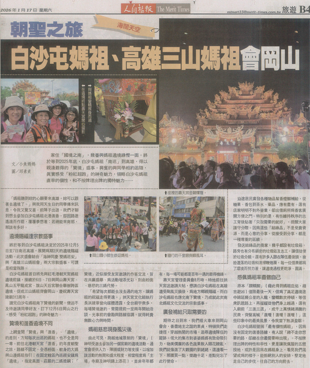 家住「國境之南」,幾番與媽祖遶境緣慳一面。終於等到2025年底,白沙屯媽祖「南巡」到高雄,得以親逢難得的「贊境」盛事。興奮的與同學相約追隨,真實感受「粉紅超跑」的神奇魅力,領略白沙屯媽祖直率的...