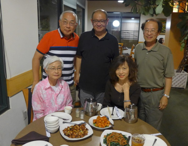 四十多年未見的老同學在Fountain Valley,CA 中華餐廳敍舊。前左:趙悌,前右:毛文英。後左:孫安福,中:劉漢倫(中華老闆),右:王曉天。(9-30-2016)
