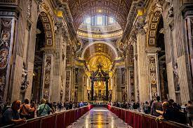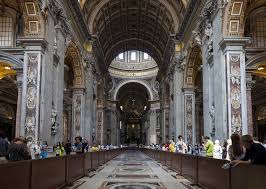 梵諦岡的主建築是聖彼得大教堂。它實在太偉大了,從1506年興建,到1626年才完成,費時120年。它是文藝復興時期的偉大建築。它的高聳,巨大,莊嚴,讓人肅然起敬。到了羅馬,必須一遊。進入聖彼得教堂,服裝有規定。男士不可以穿:拖鞋,短褲,背心,無領上衣;有領子運動衫可以。女士要穿裙子,裙子長度要過膝蓋,上身衣服不可露肩露胸。